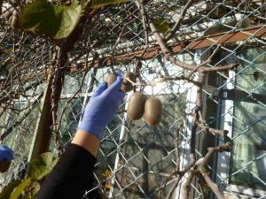キウイの果実は、収穫したままではまだ硬く酸っぱいので、追熟が必要なので、リンゴと一緒に追熟して美味しく食べ頃になるのを待ちます。