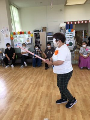 次は、夏を楽しんでもらうため、特大スイカを用意し『スイカ割り』を実施!スイカは作業療法士の手作りのレク用スイカ。衛生面を考慮し、目隠しはマスク使用、ひとり1枚。周りで見ている人も、スイカを叩く人を「右だよ」「違う、真っ直ぐ」と声を出して誘導したりみんなで盛り上がれました♪( ´θ`) 実際にスイカを割らずあてるだけでも十分楽しめました。