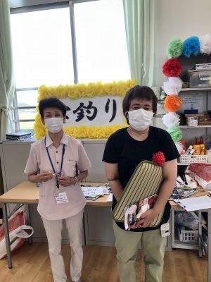 魚釣りならぬ『宝釣り』。釣り竿の糸の先に磁石を付け、クリップのついたお宝(中身が見えない景品)を釣る!釣れた時の感覚が面白くて、楽しんでいました。豪華景品を含むハズレなし。夏の暑さを少しでもしのいでもらいたく、豪華景品は“ ひんやり枕”“ひんやり枕カバー”“いぐさ座布団”。