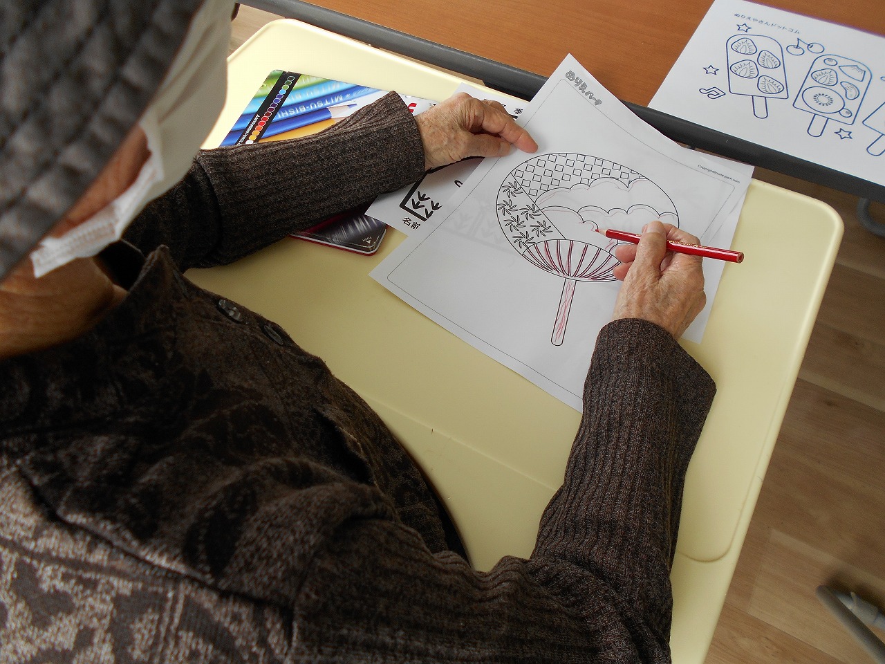 患者さん同士で塗り絵を見合うこともあります。「上手ですね」の一言から交流が生まれてくると思います。